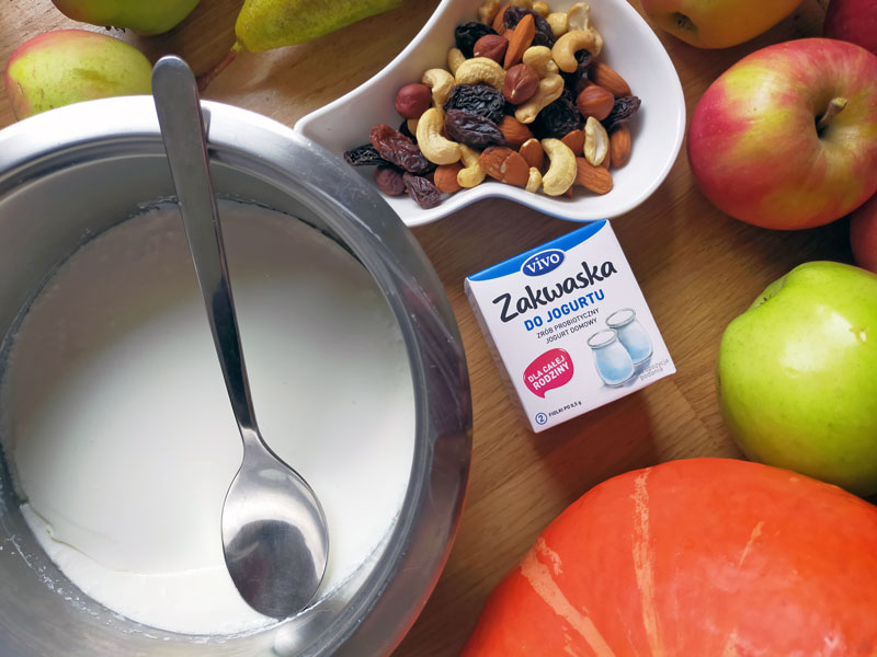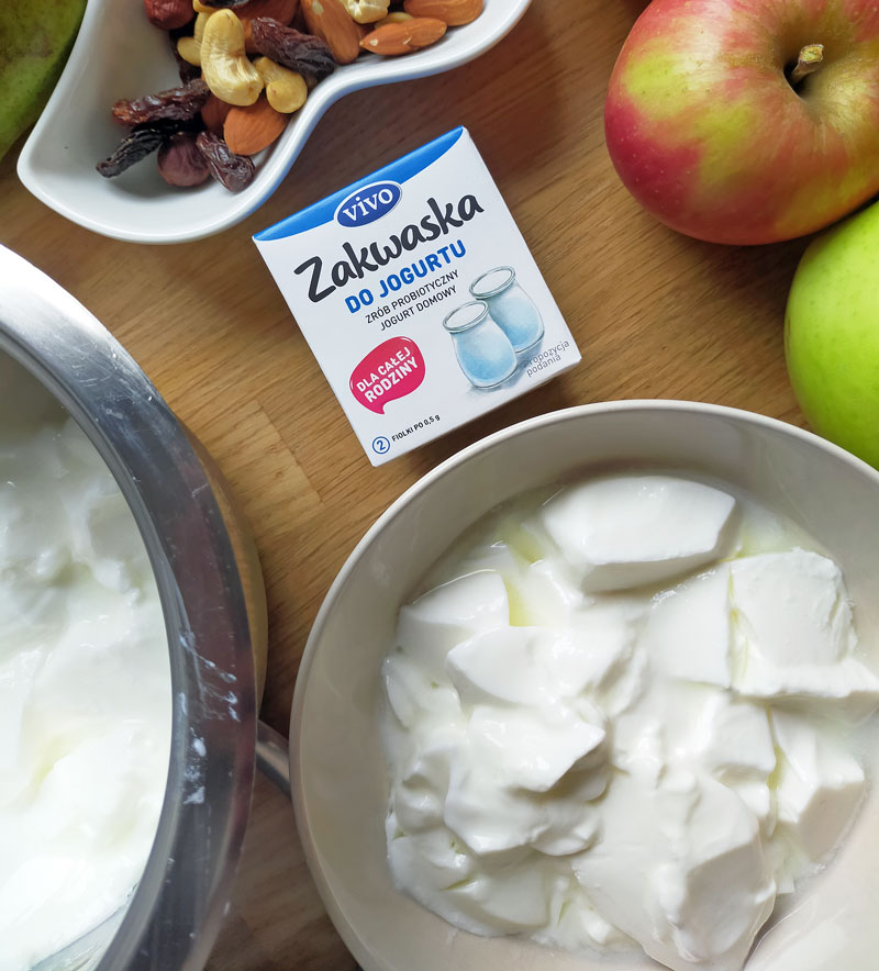 Ponownie w ruch poszła Zakwaska do Jogurtu Vivo. Niestety w procesie przygotowania popełniliśmy mały błąd – a mianowicie, zasnęliśmy 🙂 Jogurt zamiast zostać wyjęty po 8 godzinach, przeczekał w ukwaszaniu prawie drugie tyle. Czyli dodatkowo ukwaszał się całą noc. Łącznie około 16 godzin. Z pewnością gdyby nie to mógłby być nieco inny w smaku.